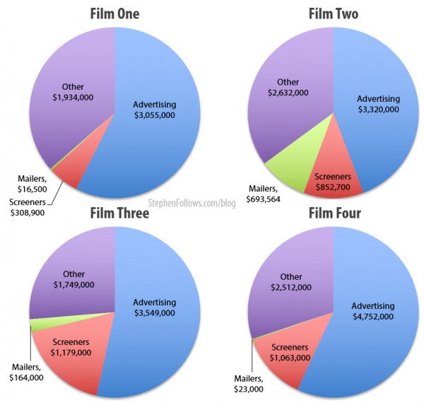 La moitié de cet argent est consacrée à la publicité selon les schémas de Stephen Follows. Le producteur prend l'exemple de quatre films, nommés en 2014, 2013 et 2011. Le budget publicitaire moyen dans une campagne est de 3,5 millions de dollars.
