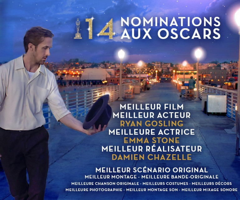 Le film, qui sortira en salles ce mercredi 25 janvier est d'ores et déjà l'un des événements du cinéma de cette dernière décennie. La La Land affrontera dans la catégorie du Meilleur Film : Arrival, Lion, Moonlight, Fences, Manchester by the See, Hell or High Water, Hidden Figures, Hacksaw Ridge. Dans la catégorie Meilleure Actrice, Emma Stone est en compétition avec Isabelle Hupert (Elle) Meryl Streep (Florence Foster Jenkins), Nathalie Portman (Jackie) et Ruth Negga (Loving). Ryan Gosling est nommé quant à lui aux côtés de Casey Affleck (Manchester by the See), Andrew Garfield (Hacksaw Ridge), Viggo Mortensen (Captain Fantastic) et Denzel Washington (Fences), pour le titre de Meilleur acteur.