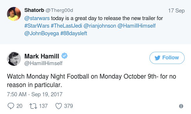Lorsqu'un énième fan a demandé à Mark Hamill sur Twitter quand sortira la seconde bande-annonce de Star Wars 8, il lui a répondu : "Regardez Monday Night Football (le match de football américain du championnat NFL diffusé le lundi soir) le 9 octobre, pour aucune raison particulière". Depuis, le tweet a été effacé ce qui n'arrête pas d'agiter les fans.
