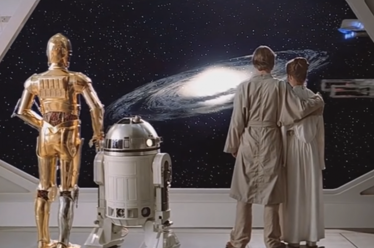 C-3PO, R2-D2, Luke et Leia à la fin de l'épisode 5