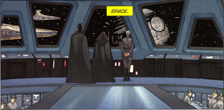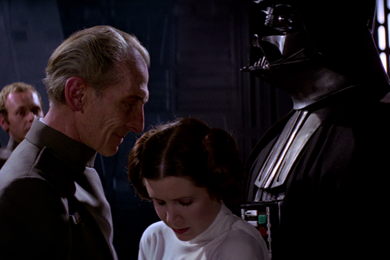 Grand Moff Tarkin devant la princesse Leia et Dark Vador