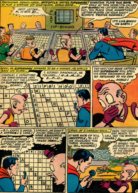 Cependant, on ne se débarrasse jamais vraiment de Mr. Mxyzptlk. Une fois son nom prononcé à l'envers, il se retrouve prisonnier de sa dimension... pour 90 jours seulement.