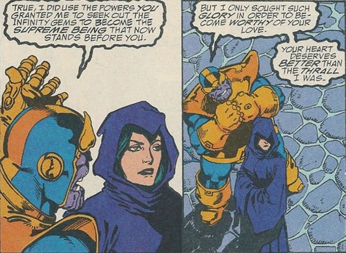 Pourquoi Thanos veut-il à tout prix les Pierres de L'Infini ? Pour dominer l'univers, mais aussi conquérir Lady Death. Dès son plus jeune âge, Thanos a développé des sentiments par cette entité abstraite. Sauf que La Mort n'a pas du tout la vocation de tomber amoureuse. Certes, elle est fascinée par le culte que lui voue le Titan, mais elle ne répond jamais à son amour. Dans les comics, lorsque Thanos parvient à s'emparer de toutes les Pierres, Lady Death refuse de devenir sa compagne, car elle ne supporte pas que le Titan lui soit supérieur. Et surtout, il détruit la moitié de la galaxie, ce qui provoque un nombre bien trop important de décès. La Mort n'aime pas qu'il déséquilibre ainsi l'univers. Charmant.