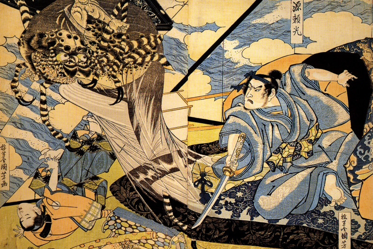 Estampe représentant Minamoto no Yorimitsu combattant un yokai ayant l'apparence d'une araignée géante