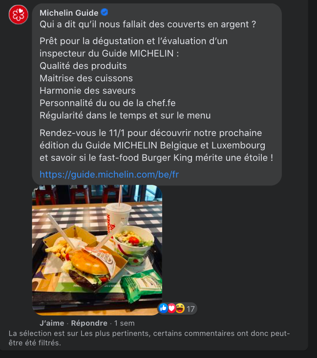 "Et puis, vous en avez beaucoup dans votre livre rouge qui proposent des mets d'exception prêts en 5 minutes et tout ça garanti sans réservation 3 mois à l'avance ?", demande également le restaurant. Cette technique de campagne s'est faite remarquer puisqu'elle est parvenue jusqu'au guide Michelin, qui a répondu avec beaucoup d'humour au fast-food.