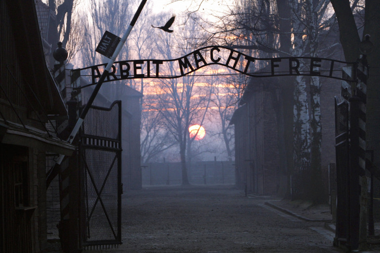 Cette photo montre le portail principal donnant accès au camp de la mort d'Auschwitz-Birkenau à l'aube. On peut lire le célèbre panneau à l'entrée du camp de concentration nazi polonais d'Auschwitz, "Arbeit macht frei" ou "Le travail vous libérera".