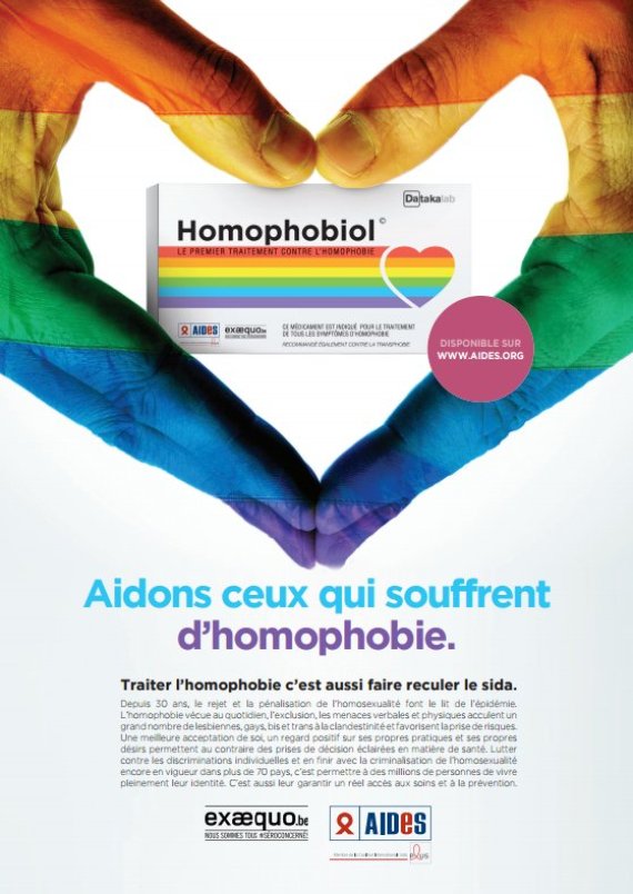 Certains décident, eux, de "soigner" l'homophobie comme d'autres ont voulu "soigner" les homosexuels à coups d'électrochocs ou d'exorcisme. Non sans humour, l'association AIDES et son homologue belge ExAEquo ont donc imaginé une solution miracle : un médicament qui soigne l'homophobie, intitulé l'Homobiol