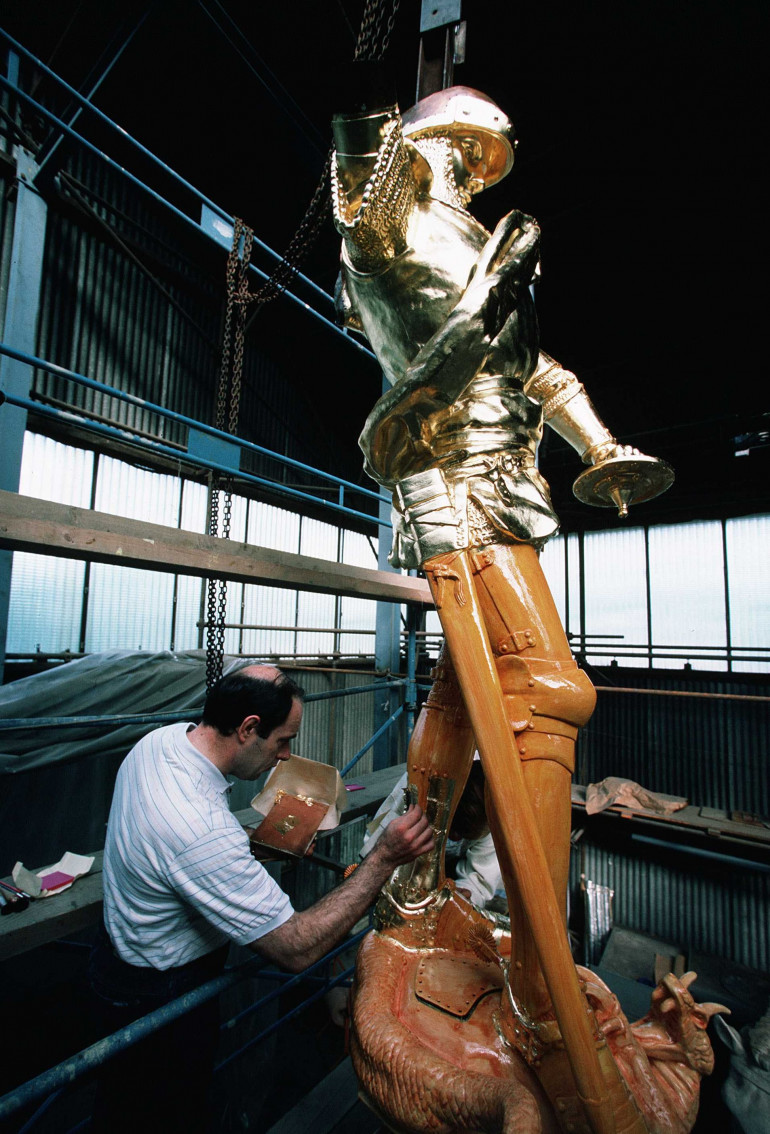 L'archange du Mont-Saint-Michel lors d'une restauration en 1987.