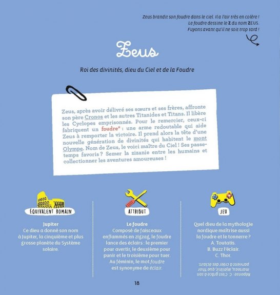 Dans Un petit dessin pour devenir une légende en mythologie" (publié aux éditions Le Robert", l'autrice propose un "fil d'Ariane" pour ne plus se perdre dans le dédale (bien complexe) de la mythologie. Chaque divinité, héros et héroïne, lieux et créature a droit à sa double page. A gauche, des explications, en bas de page 3 infos essentielles. Page de droite un dessin. Jouant sur les sonorités et l'orthographe de chaque nom.