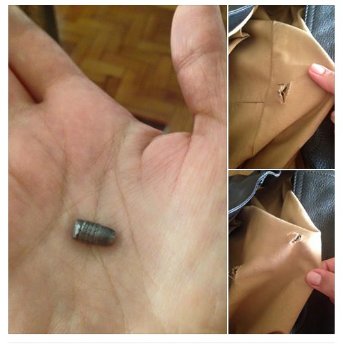"J'étais avec une amie (vendredi) en train de sortir du centre commercial quand j'ai entendu un bruit tout près de moi comme si quelque chose était tombé dans mon sac", raconte le designer, sur sa page Facebook. Elle ajoute avoir eu très peur car le bruit a été très fort, entendu également par les gens autour d'elle. "Mais aujourd'hui en prenant mon sac à main j'y ai trouvé un projectile et mon sac est déchiré à l'intérieur à quatre endroits", a-t-elle écrit lundi, photos du projectile et de son sac à l'appui.