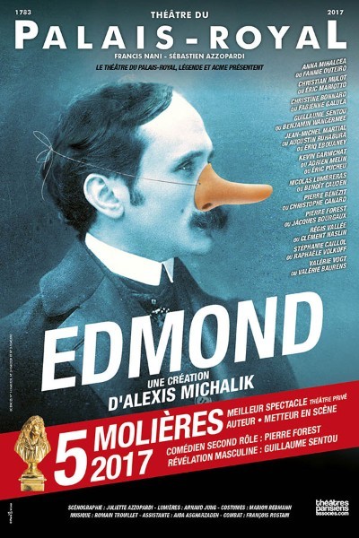Après Le Porteur d’Histoire et Le Cercle des Illusionnistes, Alexis Michalik, metteur en scène aux 8 Molières, revient pour raconter la triomphale et mythique première de Cyrano de Bergerac. Edmond, qui triomphe depuis septembre dernier avec ses douze comédiens sur la scène du Théâtre du Palais-Royal, se joue à guichets fermés et sera prolongée au moins jusqu'à décembre 2017.