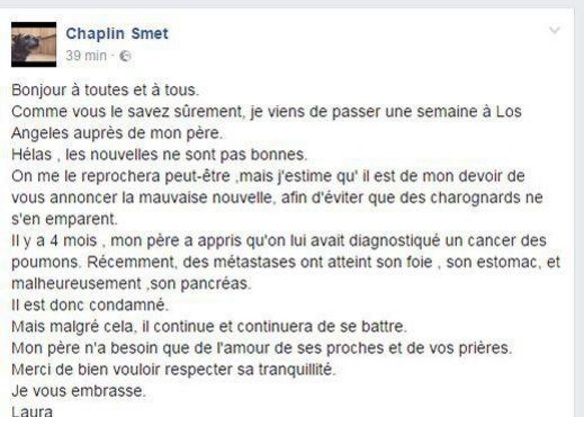 Le message allait encore plus loin en expliquant que le chanteur de 73 ans était "condamné". La fin du post se terminait par "Mon père n'a besoin que de l'amour de ses proches et de vos prières. Merci de bien vouloir respecter sa tranquillité". L'agent de Laura Smet a ensuite expliqué à L'Express que c'était un piratage. "Laura vient de le découvrir sur son compte et va déposer plainte", a-t-il ajouté. L'avocat Hervé Temime a même expliqué via l'AFP que l'actrice va porter plainte contre X ce 7 mars devant le Tribunal de Grande Instance de Paris pour "usurpation d'identité sur un réseau de communication au public en ligne, collecte frauduleuse de données à caractère personnel, vol d'information, recel et introduction dans un système de traitement automatisé de données".
