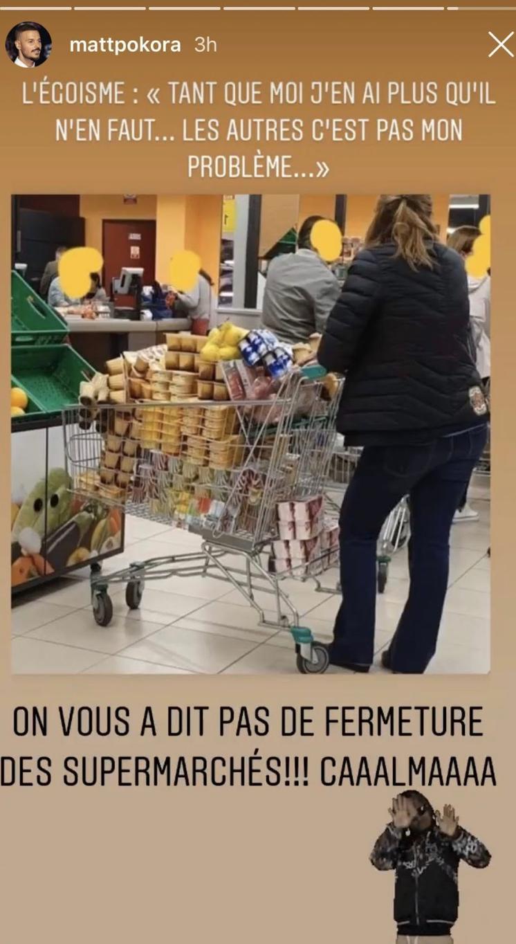 Ce dimanche 15 mars, Matt Pokora semblait remonté contre la réaction de certaines personnes face à l'épidémie et au confinement. Le chanteur a partagé en story sur Instagram, la photo d'une cliente de supermarché, avec le caddie rempli de provisions.