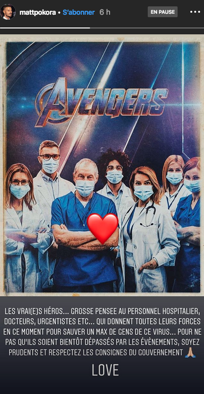 Ce lundi, il a de nouveau publié une story sur l'épidémie qui touche le pays mais cette fois pour témoigner son soutien au personnel hospitalier, "ces vrai(e)s héros", écrit-il.