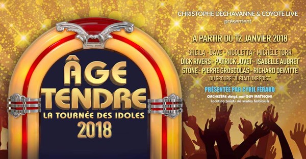 En 2018, dix artistes se sont donnés rendez-vous sur scène avec Âge Tendre : Sheila, Dave, Nicoletta, Michele Torr, Dick Rivers, Patrick Juvet, Isabelle Aubret, Stone, Pierre Groscolas, Richard Dewitte... Leur objectif : offrir à leur fans un spectacle encore plus festif, accompagnés en live par Guy Matteoini et ses musiciens.