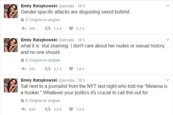 Quoi qu'il en soit, rien ne justifie selon Emily Ratajkowski, la violence envers la première dame, notamment celle d'un journaliste du New York Times. C'est sur Twitter que la jeune mannequin s'est agacée du comportement de ce dernier, qui lui aurait dit "Melania est une pute". Ce à quoi elle répond, "Quelles que soient vos opinions politiques, il est essentiel d'appeler cela par son nom : du 'slut shaming'", que l'on pourrait traduire par "humiliation des 'salopes'".