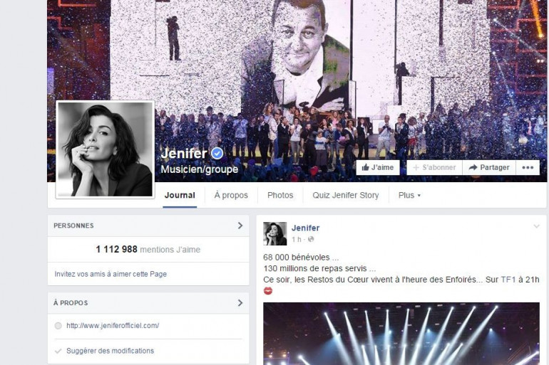 20h30 - La chanteuse Jenifer a changé sa photo de couverture sur Facebook pour une photo de la troupe des Enfoirés sur scène. La jeune femme rappelle en quelques chiffres le travail de l'association "68.000 bénévoles... 130 millions de repas servis"