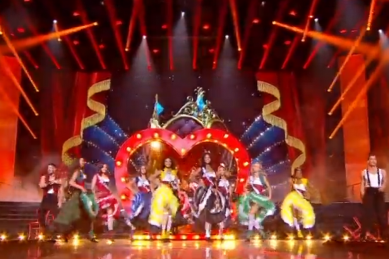 21h28 - Voilà l'heure du tableau Les Miss au cabaret, sans doute un hommage qui plaira à Line Renaud, ancienne meneuse de revue au Lido. Marmelade du film Moulin Rouge, Shania Twain et le French cancan s'enchaîne à un rythme effréné.