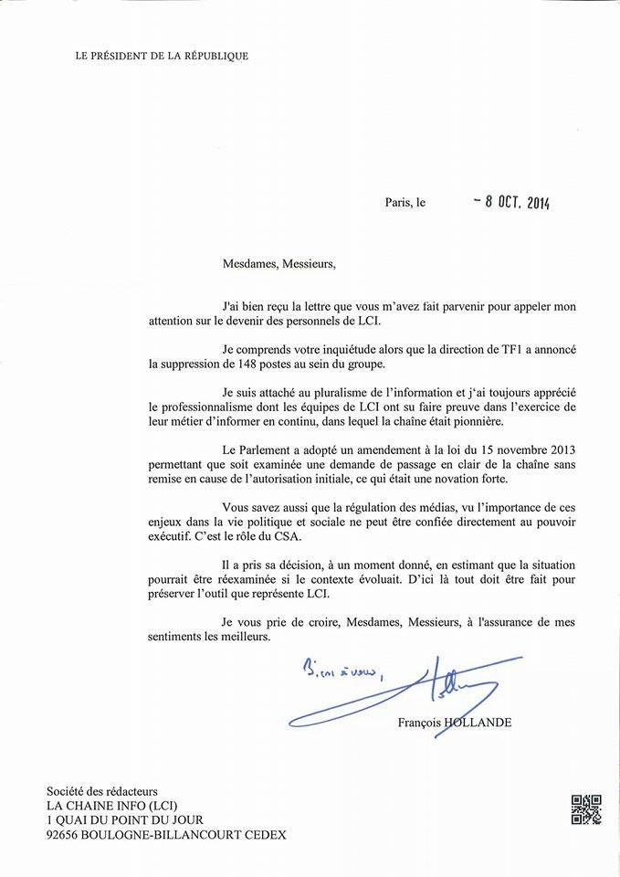 Jeudi 2 octobre, les salariés de LCI manifestaient à proximité du CSA à l'occasion de la venue du président de la république, François Hollande. À cette occasion, ils avaient pu lui remettre une lettre dans laquelle ils lui demandaient son aide pour que survive la chaîne dont le CSA a refusé fin juillet le basculement sur la TNT gratuite.