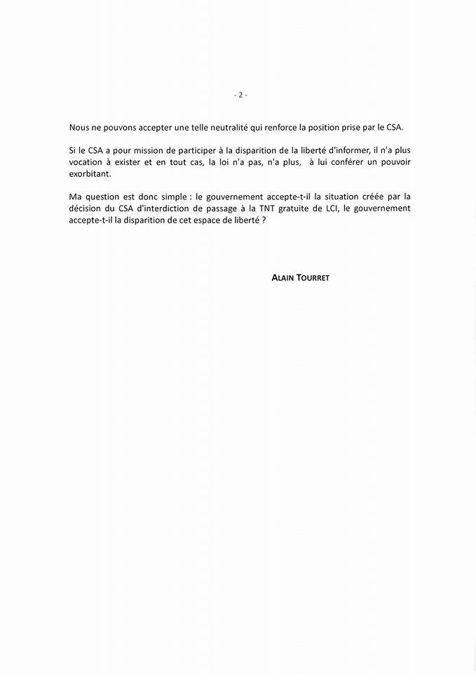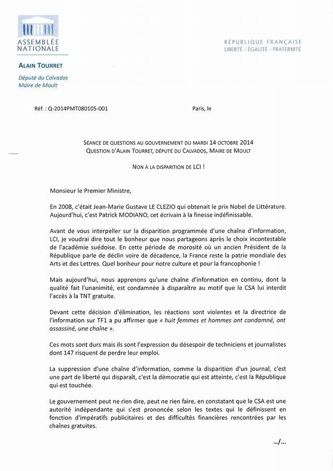 Ce mardi 14 octobre, le député maire de Moult (Basse-Normandie), Alain Tourret (PRG), interpellera le premier ministre et le gouvernement sur l'avenir de la chaîne. Selon lui "si le CSA a pour mission de participer à la disparition de la liberté d'informer, il n'a plus de raison d'exister". Le conseil d'État doit rendre sa décision d'ici la fin du mois d'octobre.