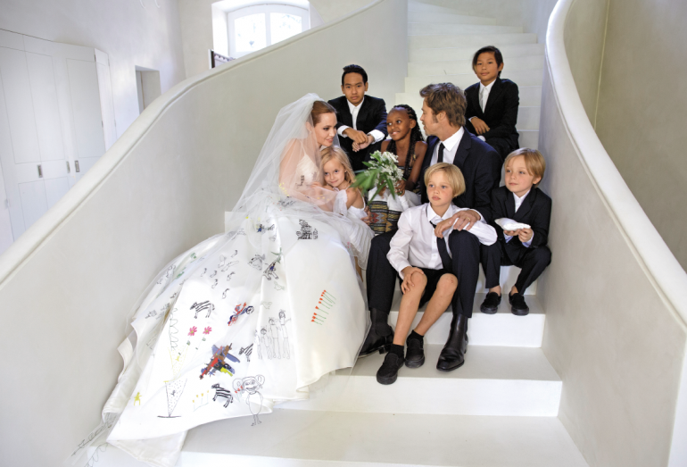 Angelina Jolie et Brad Pitt se sont mariés le 23 août 2014 dans le château de Miraval, leur propriété du Var (France). La cérémonie est restée secrète jusqu'à la dernière minute. Néanmoins, les jeunes mariés ont posé pour le magazine People, dévoilant ainsi leurs noces. Angelina Jolie portait à cette occasion une robe blanche, recouverte de dessins d'enfants cousus dans le tissu. Les deux acteurs s'étaient rencontrés en 2005 lors du tournage du film Mr. et Mrs. Smith.