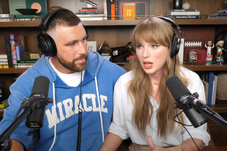 Taylor Swift et Travis Kelce dans le podcast "New Heights", publié le 13 octobre