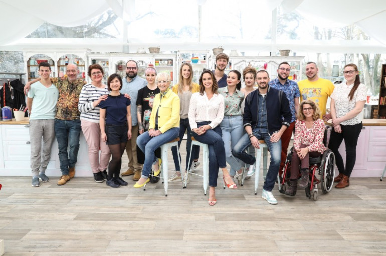Les 14 candidats de la saison 8 du "Meilleur pâtissier" entourent Julia Vignali ainsi que les jurés Mercotte et Cyril Lignac