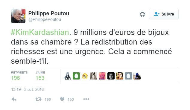 Le fait qu'un tel acte soit commis contre une célébrité comme Kim Kardashian, considérée comme une papesse de la superficialité, a déclenché une vague de tweets "humoristiques" contestables et contestés. Premier exemple, Philippe Poutou qui a expliqué voir ce vol comme un mode de redistribution des richesses. "#KimKardashian. 9 millions d'euros de bijoux dans sa chambre ? La redistribution des richesses est une urgence. Cela a commencé semble-t-il", a tweeté le candidat anti-capitaliste à la présidentielle. Un tweet qui a soulevé l'indignation.