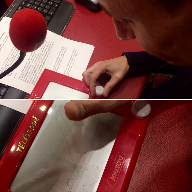 - Le Télécran de Joustra : on dessine avec 2 mollettes une qui va de bas en haut, l’autre de gauche à droite. On secoue pour effacer. Un jouet qui a réveillé l'âme d'artiste d'Eric Dussart...