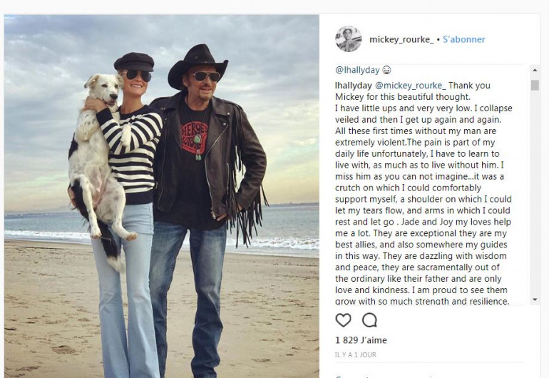 Sur le réseau social Instagram, Mickey Rourke a posté une photo du couple Hallyday sur une plage accompagné du message suivant : "Vous pouvez vous payer le style, mais vous ne pouvez pas vous payer la classe. Le grand amour, Johnny et Laeticia. Beaucoup d'amour, Mickey", a écrit l'acteur avant de conclure : "Garde-moi une place (repose en paix)".
