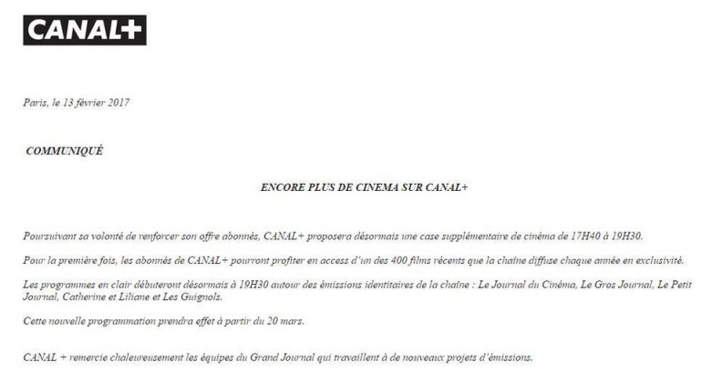 Ainsi, Le Grand Journal saute, mais quelques programmes en clair restent. Les téléspectateurs pourront alors retrouver Le Journal du Cinéma, Le Gros Journal, Le Petit Journal, Catherine et Liliane et Les Guignols. La nouvelle grille commencera le 20 mars prochain. "Canal + remercie chaleureusement les équipes du Grand Journal qui travaillent à de nouveaux projets d'émissions", conclut le document.