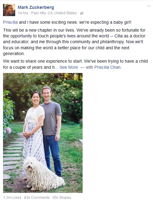 Mark Zuckerberg et sa femme Priscilla ont annoncé qu'ils allaient bientôt être parents.