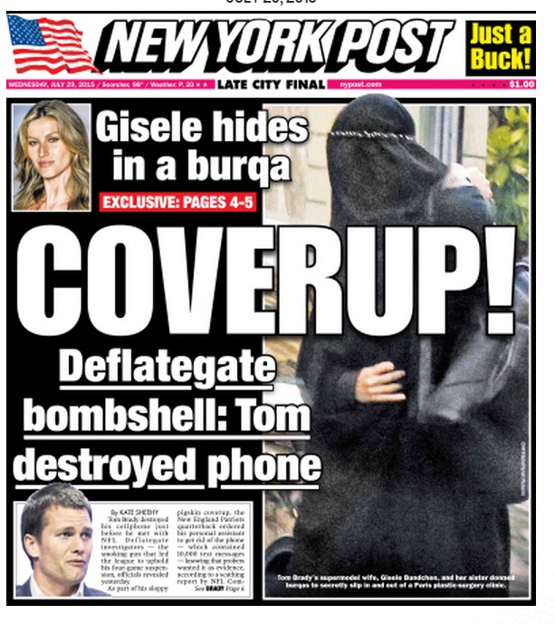 Plusieurs médias soulignent que Gisele Bündchen se déplace en plein Paris vêtue d'un voile intégral, alors que celui-ci est interdit en France depuis la loi de 2010. Le New York Post, de son côté, s'indigne qu'elle ait choisi une tenue religieuse pour se cacher. "Si tu ne voulais pas être vue, tu aurais pu choisir quelque chose de moins connoté, dénué de signification religieuse et culturelle".