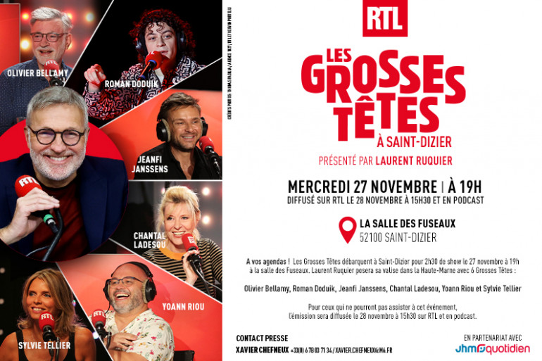 Les "Grosses Têtes" reprennent la route ! Après Angoulême, Montluçon, Fourmies et plus récemment Le Mans, le célébrissime programme de RTL débarque en Haute-Marne, pour une émission exceptionnelle depuis Saint-Dizier (52). Un enregistrement prévu le 27 novembre prochain à 19h, dans les conditions du direct, dans la salle de spectacle "Les Fuseaux". Près de 2.200 personnes sont attendues.