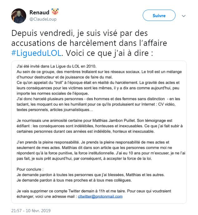 "Mes conneries, je les assume assure-t-il. Celles des autres, non merci. Est-ce que j'ai tweeté de la merde en 11 ans? Oula, mais bien sûr. Et c'est pas un motif de fierté. Un autre Alexandre [Léchenet, journaliste qui avait dans un post de blog de mai 2018 fait son mea culpa pour des histoires similaires sans faire partie de cette Ligue du LOL, ndlr] expliquait récemment tout par ici".