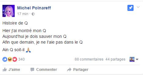Depuis le début de sa carrière, Michel Polnareff a toujours joué avec les mots, les doubles sens, brouillé les pistes. Il manie à la perfection l'art du mystère. Pour sa première réaction depuis le son hospitalisation, l'artiste reste fidèle à ses habitudes. La star aux célèbres lunettes blanches a ainsi écrit sur Facebook : "Histoire de Q / Hier j'ai montré mon Q / Aujourd'hui je dois sauver mon Q / Afin que demain, je ne l'aie pas dans le Q / Ain Q soit-il".