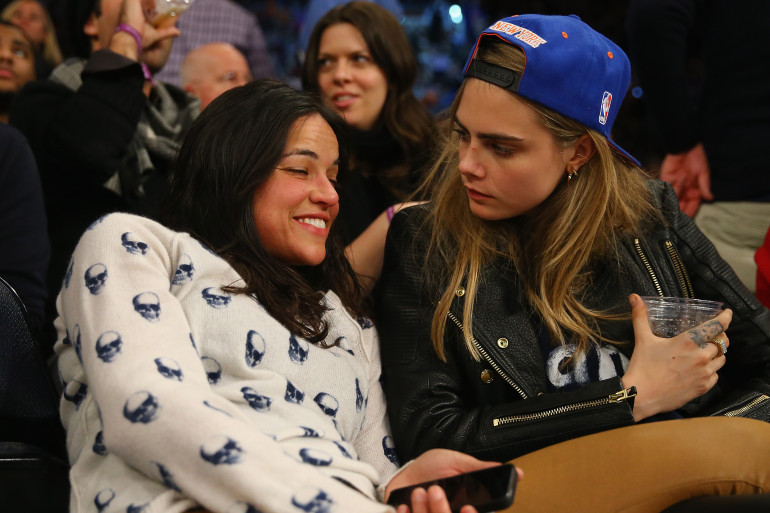 L'actrice Michelle Rodriguez et le mannequin Cara Delevingne lors d'un match de basket, le 7 janvier 2014 à New York.