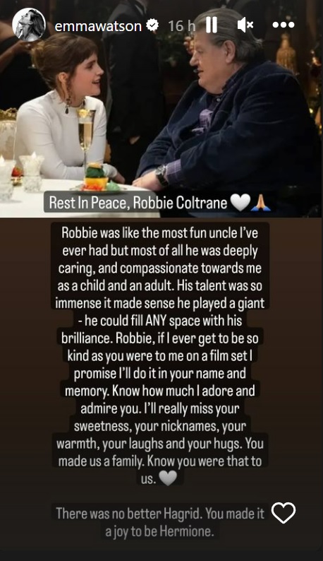 "Robbie était comme l'oncle le plus amusant que j'ai jamais eu, mais surtout, il était profondément attentionné et compatissant envers moi, enfant et adulte. Son talent était si immense qu'il était logique qu'il joue un géant (...)", a d'abord écrit l'actrice, elle aussi révélée dans Harry Potter, à ses plus de 68 millions d'abonnés avant de s'adresser directement à l'ancien gardien de Poudlard.