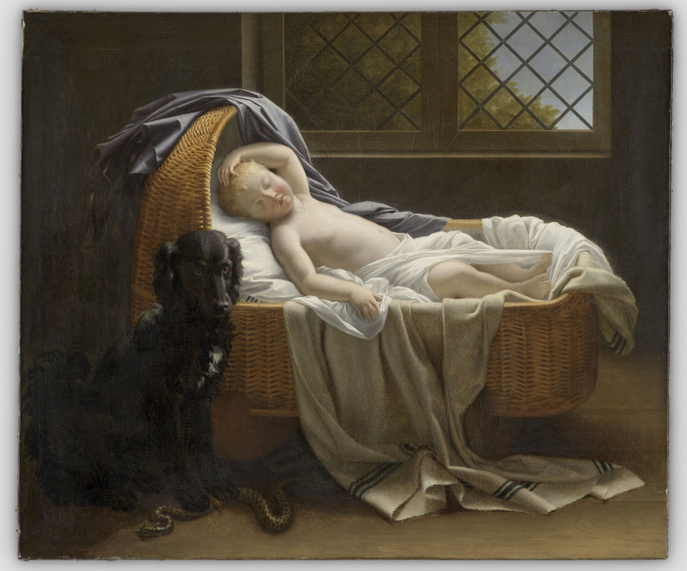 Enfant endormi dans un berceau sous la garde d'un chien courageux qui vient de tuer près de lui une énorme vipère de Jeanne Élisabeth Chaudet