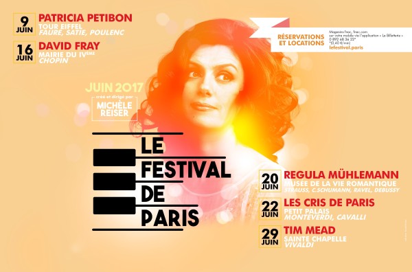 Rendre accessible la musique classique au plus grand nombre et rassembler toutes les générations autour d'une programmation haut de gamme, c’est le défi lancé par le Festival de Paris du 9 au 29 juin 2017. Au programme de cette première édition, des artistes de renommé internationale tels que : Patricia Petibon, David Fray, Regula Mühlemann, Les Cris de Paris et Tim Mead. La Mairie de Paris, le Ministère de la Culture et Vivendi sont partenaires de ce festival.