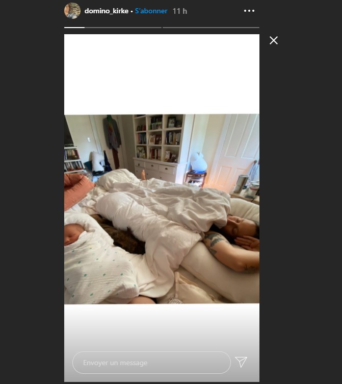 Domino Kirke a partagé la naissance de leur fils avec une photo dans sa story Instagram où son nouveau-né dort paisiblement à côté de sa mère. La sage-femme a aussi partagé une photo d'un dessin représentant un cœur réalisé avec ce qui serait le placenta du bébé.
