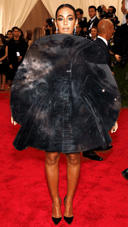 Solange Knowles, la sœur de Beyoncé, s'est également faite remarquer avec une robe noire à la forme particulière. De nombreux internautes ont remarqué une ressemblance entre la robe et le "trou de ver" modélisé dans le film Insterstellar de Christopher Nolan. Les héros du film empruntent le passage avec leur vaisseau spatial pour rejoindre un recoin inexploré de l'univers.
