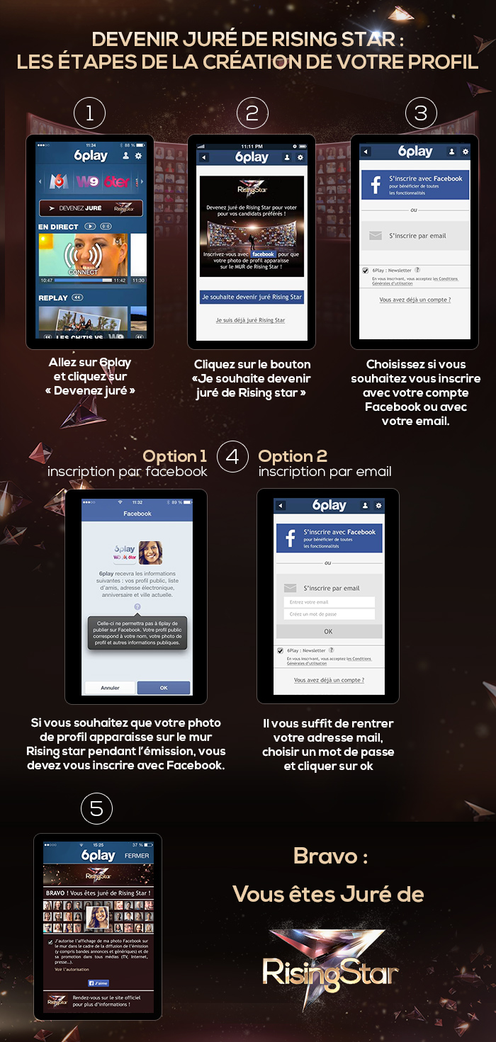 La plateforme 6Play nécessite une inscription pour être utilisée. Il est possible de s'inscrire soit par e-mail, soit en passant directement par son compte Facebook. Dés lors c'est votre photo de profil Facebook qui sera directement utilisée pour apparaître sur le mur digital de l'émission.