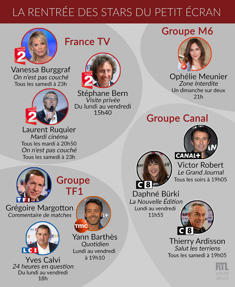 Sur les historiques France 2 et France 3, les grilles subissent une refonte générale. L'émission de Laurent Ruquier, On n'est pas couché, se dote d'une nouvelle chroniqueuse, Vanessa Burggraf. Ancienne animatrice d'une émission de débats sur la chaîne internationale France 24, elle succède à Léa Salamé qui aura sa propre émission culturelle et qui continuera son interview matinale chez France Inter.