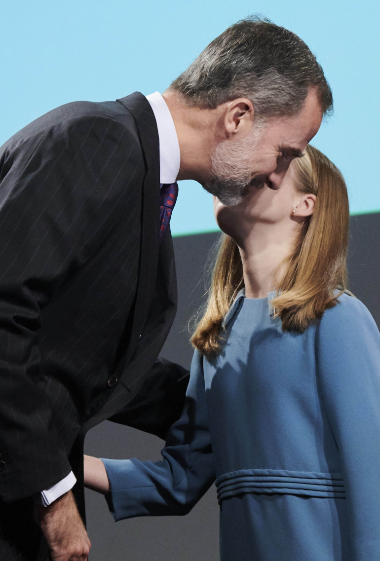 Après ce discours, que l'on imagine stressant pour l'adolescente, le père et la fille se sont embrassés tendrement sous le regard de la reine Letizia et de l'infante Sofía, la petite sœur de Leonor, et de dizaines de photographes et journalistes, avant de quitter l'estrade.