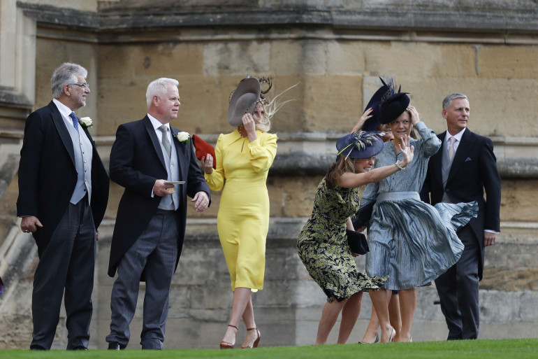 Les invités d'Eugenie et Jack face au vent avant d'entrer dans la chapelle St George