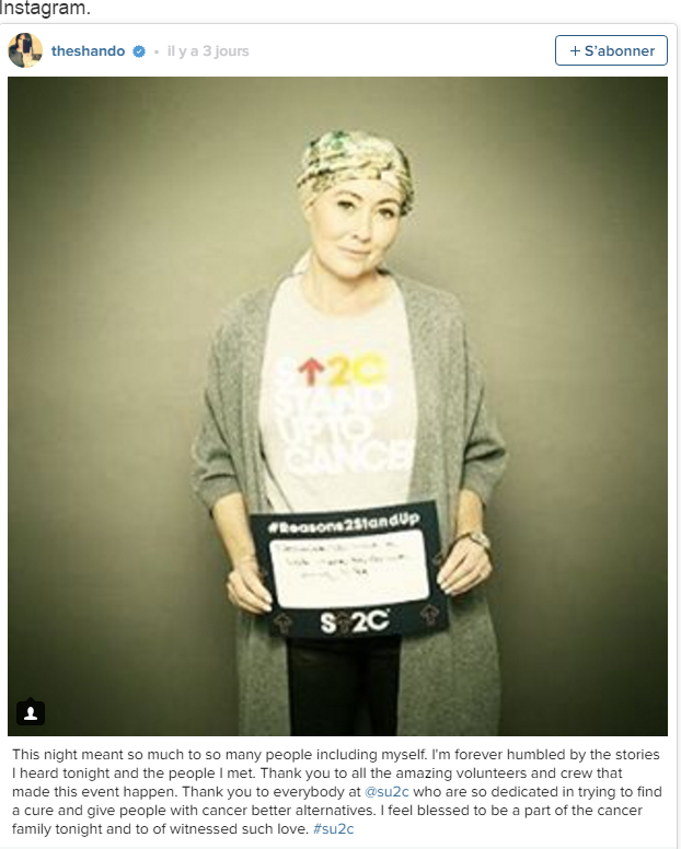 Shannen Doherty poursuit son combat contre le cancer. Dans le cadre de la soirée de bienfaisance Stand Up to Cancer qui se déroulait à Los Angeles, en présence de Céline Dion, vendredi 9 septembre, l'actrice de 45 ans, diagnostiqué d'un cancer en mars 2015, s'est montrée combative. "Le cancer a, d'une manière étrange, fait des choses incroyables pour moi. Il m'a permis d'être moi-même, d'être beaucoup plus en contact avec qui je suis, d'être beaucoup plus vulnérable et finalement de devenir à nouveau la personne que j'ai toujours été", a-t-elle déclaré au micro de la chaîne américaine E.T.