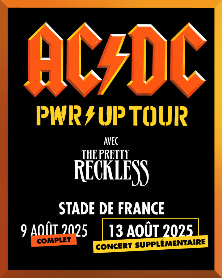 AC/DC double la mise. Angus Young et sa bande annoncent une seconde date au Stade de France le 13 août 2025 dans le cadre du PWR UP Tour, en plus du 9 août. (Mise à jour : les deux concerts affichent complets dans les billetteries, mais quelques places ont été remises en vente uniquement sur le site officiel de Gérard Drouot Productions).