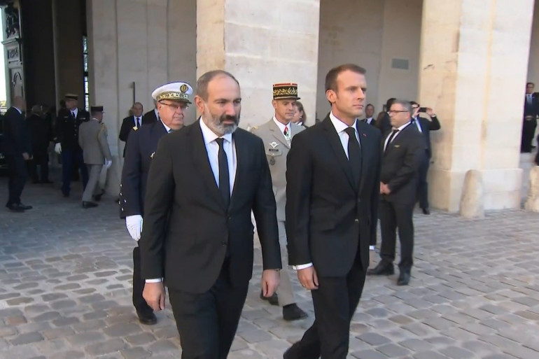 10h10 - Emmanuel Macron et son épouse Brigitte viennent d'arriver place des Invalides. Le président de la République est accompagné du Premier ministre arménien et ils marchent côte à côte.
