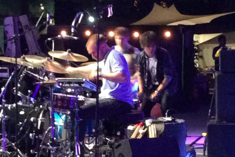 Jamie Cullum avec ses musiciens derrière la batterie sur scène dimanche 13 juillet 2014